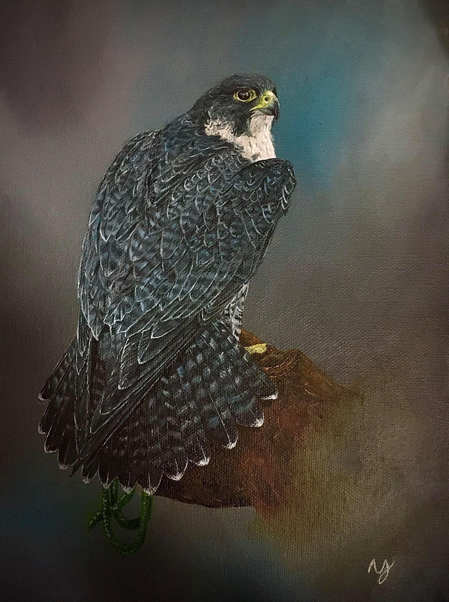 Tiercel Peregrine on the fist, just finished. Acrylic on a small canvas. by Naomi Johns