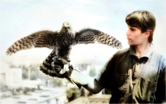 Ukrainian falconer Rostislav Sorish with young Goshawk on 29 July 1989