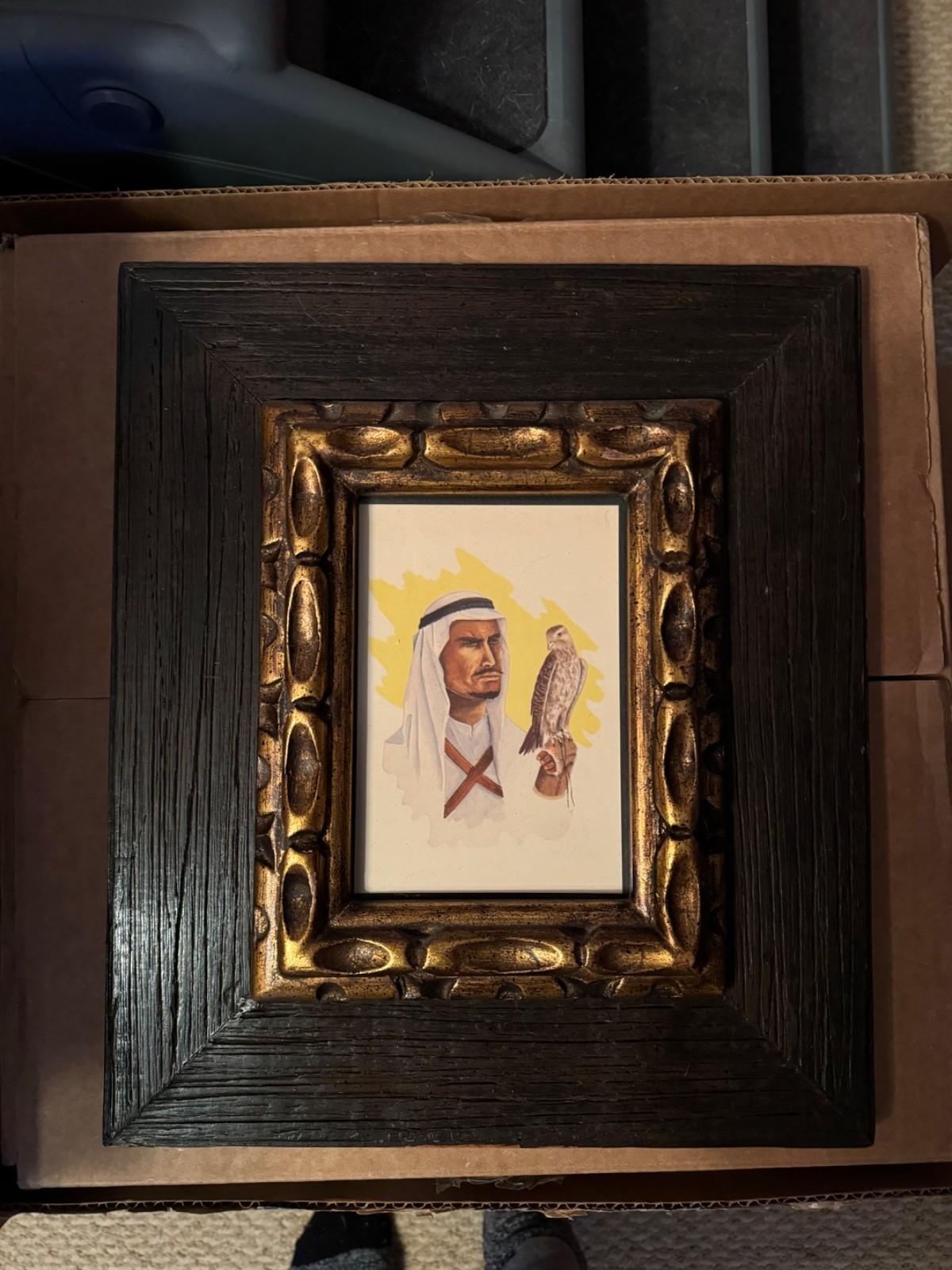 Vintage Saudi Arabian Falconer Gilt Wood Framed Art Picture Sheikh With Falcon