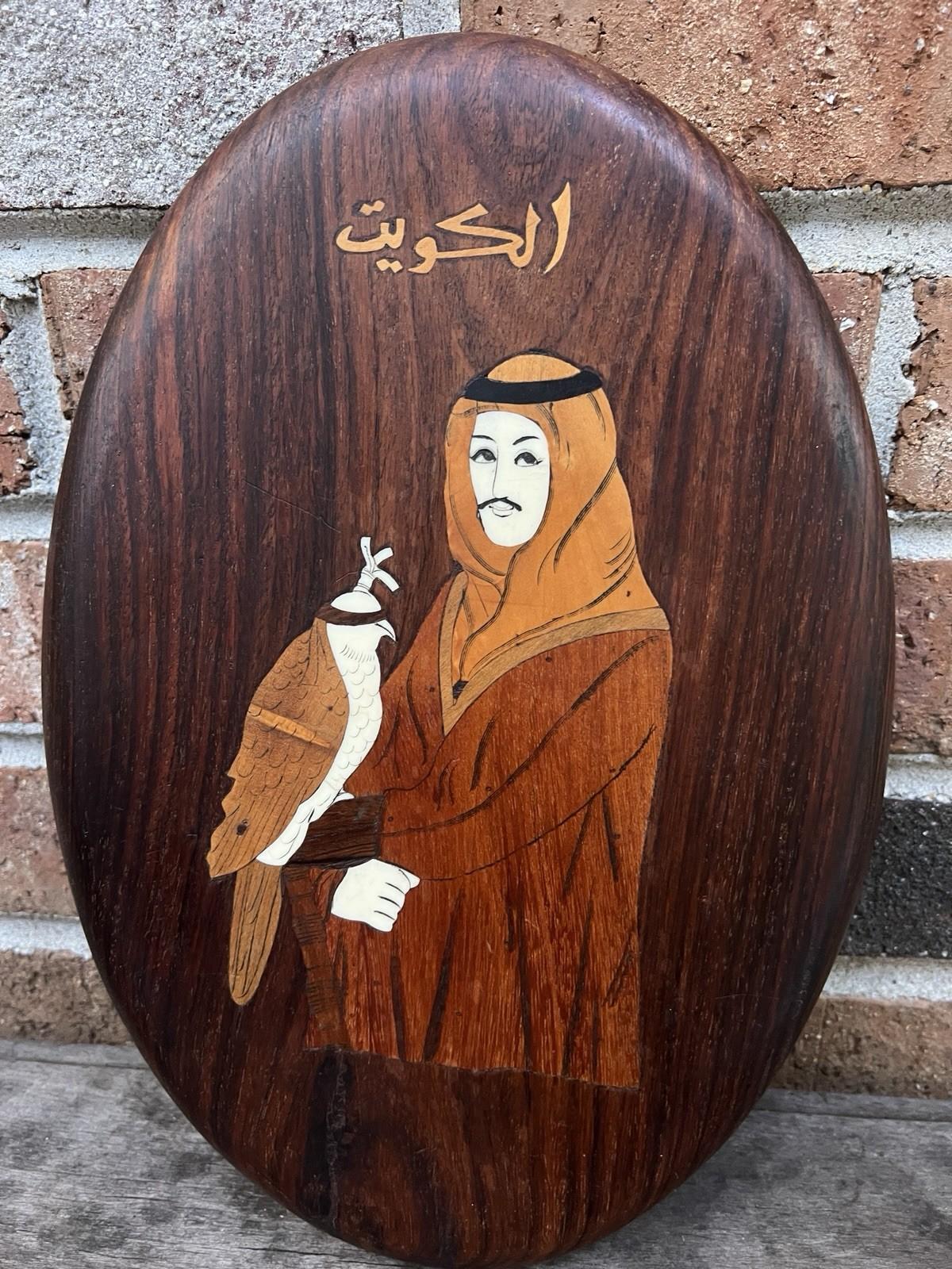 VINTAGE SAUDI ARABIA FALCONRY INLAID WOOD PLAQUE WALL DECOR FALCON 8"W X 11 3/4"